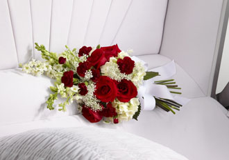 A plain, unembellished casket can be disheartening to look at, which is why it's crucial to adorn it with a captivating flower arrangement. The Forever in Our Hearts Casket Adornment is one such decoration that can enhance the beauty of the funeral. This casket spray features a stunning flower arrangement that speaks volumes. The arrangement consists of exquisite red roses, mini carnations, white hydrangea, larkspur, snapdragons, and Queen Anne's Lace.
