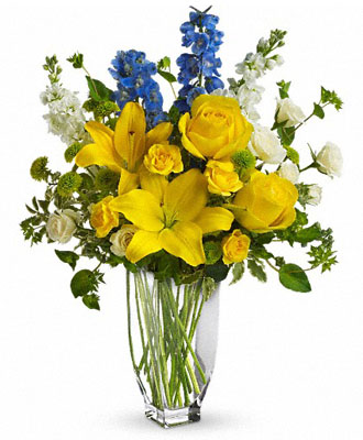 This stunning masterpiece features a vibrant combination of yellow roses, asiatic lilies, and spray roses, adorned with white roses and blue delphinium. Not only will it add an air of elegance and sophistication to any space, but it is also guaranteed to bring joy and happiness to your loved one.