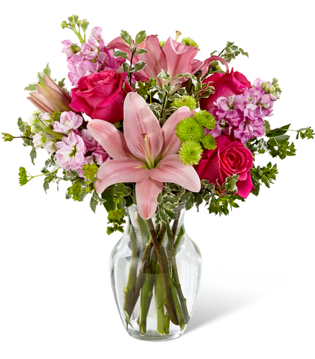This magnificent floral arrangement is perfect for congratulating or thanking someone and is ideal for any special occasion, from birthdays to anniversaries to expressing gratitude. The Pink Posh Bouquet features stunning hot pink roses, pink Asiatic Lilies, bupleurum, green button poms, and lush greens, creating a perfect color scheme. The bouquet comes in an elegant, transparent glass vase, making it an excellent way to express your sweetest sentiments.