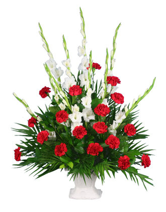 Parting with a loved one is always a challenge. In moments when words fall short, a heartfelt tribute can provide comfort. Our Red and White Floor Basket of memorial flowers gracefully symbolizes the richness of life and the sorrow of departure. This bouquet captures these opposing sentiments through the combination of dark red carnations and white gladioli.