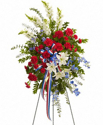 We present to you our Sacred Duty Spray bouquet, an ideal choice for such revered events. This fragrant bouquet features patriotic hues of red, blue, and white, tied together with a matching ribbon. Each blossom carries a profound significance, and the stunning arrangement represents the ultimate act of tribute to the fallen soldiers.