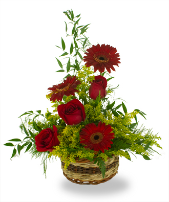 Our exquisite floral arrangement features sensational gerbera daisies, flourishing red roses, and pristine golden solidago. The gerbera daisies represent cheerfulness and heartfelt emotions, while the roses symbolize true love and affection. The solidago denotes encouragement and growth, wishing your loved one a prosperous life ahead.