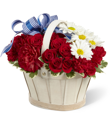 Take your Fourth of July festivities to the next level by sending warm wishes with our Justice Basket. It is an excellent way to express your genuine patriotism and communicate the right message. The white-washed basket is jam-packed with red spray roses, red carnations, mini red carnations, and white daisies, all tied together with a stunning blue designer ribbon.