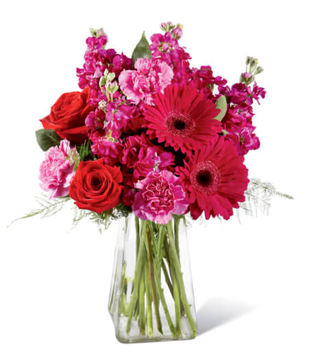 This bouquet showcases the power of pink with its stunning blooming flowers arranged in an exquisite manner to make the recipient's day unforgettable. The bouquet features gorgeous red roses, hot pink carnation petals, and gerbera daisies and gilly flowers, adding a touch of fun and fancy. All of this is completed with lush greens and presented in a square clear glass vase, adding sophistication and elegance.